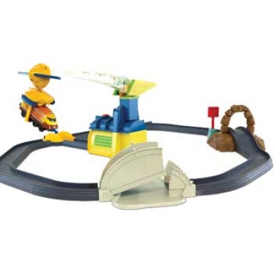 В набор входят: трек-железная дорога с разводным мостом и каменной аркой, паровозик Чаггер, гараж с взлетно-посадочной площадкой и рычагом для полетов.