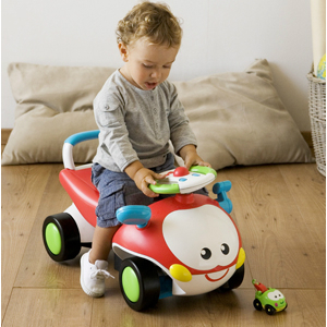Универсальный автомобиль, который растет вместе с ребенком, независимо от того, сидит ли он или стоит; способствует развитию его моторики и самостоятельности. Место для игрушек, мелодии и разные занятия.