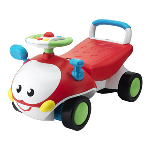 Универсальный, удобный, устойчивый и прочный. Широкие колеса. Руль с тремя мелодиями (15´´) и клаксоном. Зеркало заднего вида, имитация ручки переключения передач (ход вперед и назад) и погремушка. Спинка, которая превращается в ручку (вертикальное положение), фиксирует малыша и придает ему уверенности. Есть багажник для игрушек.