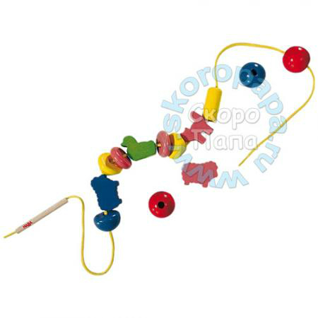 Шнуровка Haba. Опять же в аистбоксе была. Качественная, гладкие фигурки, разные формы, сейчас учимся сортировать по внешнему виду.