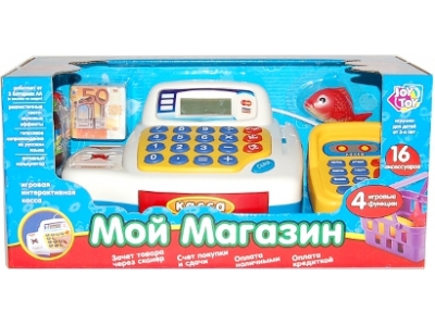 Кассовый аппарат "Мой магазин" 16 предметов!Дети очень любят играть в магазин! Поэтому им нужна почти настоящая касса. Представленный набор очень понравится детям, ведь в него входят также продукты и многое другое, что может понадобиться для интересной и увлекательной игры. Благодаря таким игрушкам дети готовятся к будущей жизни. Голосовое сопровождение на русском языке, свето-звуковые эффекты, активный калькулятор. Зачет товара через сканер, счет покупки и сдача, оплата наличными, оплата кредиткой. 4 игровых функций и 16 аксессуаров.