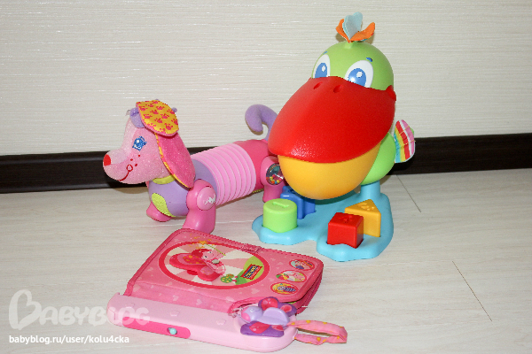"TINY LOVE", наверное, есть у всех, очень хорошие игрушки!!!! Собачка Фиона до сих пор горячо любима.