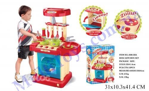 Ее почему-то "для мальчиков" называют. Хотя, как по мне, вполне девченочья. У сестры критерий был: не маленькая, с музыкой. Что имеем: в разложеном виде 65 см (не маленькая). Конфорки светяться, духовка тоже, пикает и издает булькающие звуки. С посудой и всеми прибамбасами. На батарейках.