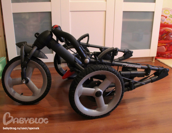 Шасси складывается двумя руками. Чтобы сложить в багажник форд фокуса приходилось снимать переднее колесо.