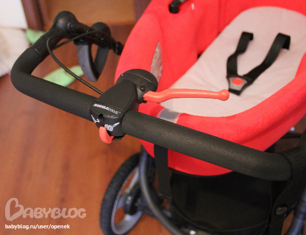 Педаль-тормоз, так же на ручке есть петелька, которая одевается на руку для дополнительной подстраховки, чтобы коляска никуда не уехала.