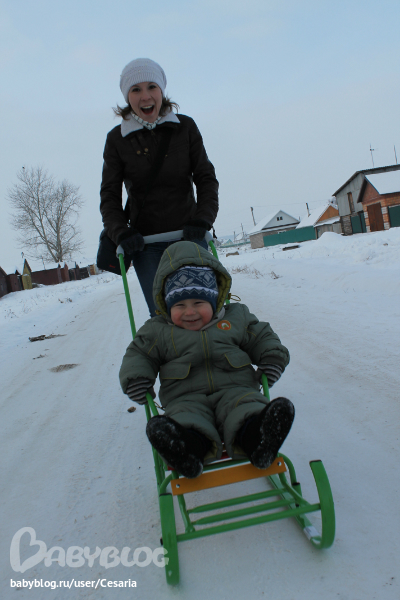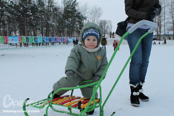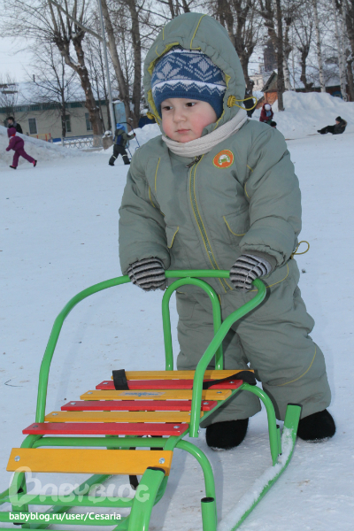 Ручка переставляется вперед и назад, т.е. мелыш может ехать лицом вперед или лицом к родителям, удобная подножка, ноги не проваливаются и не так выпрямлены (как на санках в наше время), малышу очень удобно, он с них даже слазить не хотел)) Еще думаем обязательно нужен матрасик или специальные чехол, чтобы мягко и нехолодно было))) Ну и немного фото:
