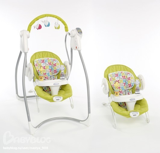 мы купили в месяц graco duo 2 в 1,в начале в основном исползовала как шезлонг,а с 3-х месяцев может в качелях по 40-50 минут качатся иногда даже засыпает(но у нас проблема с перекладывание,я снимаю шезлнг,отношу в комнату быстро перекладываю на диване,он просыпается я даю грудь и может проспать часик), меня часто спасает на кухне,когда готовлю или ем он сидит грызет игрушку и я вроде рядом!!но нужно брать минимум до 11 кг,у подруги качели до 9кг( ребенок в 6 мес 9 кг был) он его перерос!!