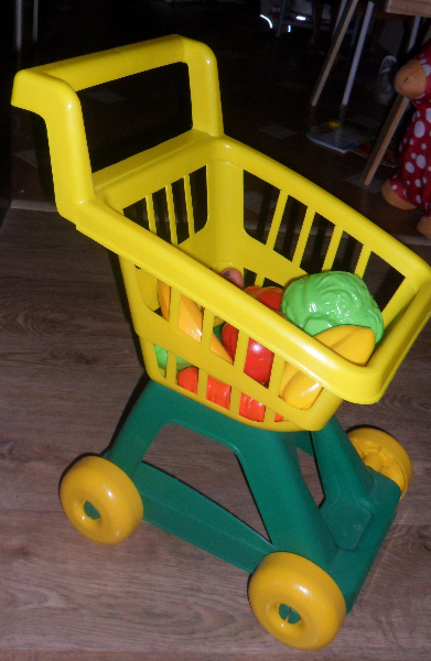 11.Мега ХИТ!!!!!!!!!!!!!!!!!Цена 200 руб!!!!!!!!!!!!!!!!!!!Тележка для супермаркета.В ней лежат овощи пластмассовые(мыть удобно и не пахнут,лучше чем резиновые)-цена 260 руб в "Кораблик".Возит и возит,перекладывает и обратно.Знает все овощи по названиям,по просьбе может достать нужный.Пытаемся учится играть в магазин!!!!!Всем советую,хорошая игрушка!!!!!!!!!