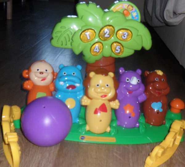 9.Соседка подарила Боулинг Vtech с животными Африки-знаю что был куплен в "Кораблике"по акции за 2300 р.Написано-возраст от 18м.Почти никак(((((Думала понравится,а дочь не играет.Если только целенаправленно посадить и самой начать играть.Пару раз мяч бросит и уходит.В основном просто может нажать на кнопочку-чтоб музыка заиграла(поёт "Чунга-Чанга" и приглашает к игре....)Моё мнение-игрушка на возраст 1г-1,5г.Похоже нам уже поздно она(-проскочили!!!!!Ну может ещё понравится-если спрятать и достать снова....Там ведь и музыка,и животные,и мяч.И цифры можно учить.И вдвоём можно на очки играть!!!!!!!