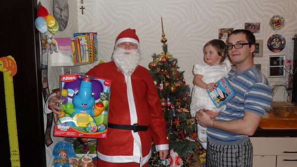 7.Нарядили мы 30-го декабря нашего соседа Дед Морозем(костюм купили в АШАНЕ за 300 руб)-заказывать профессионалов не стали пока,боялись как дочь отреагирует,вдруг испугается......И вообщем были правы-сначала заинтересовалась,потом испугалась))))))Но фото сделать успели.А достал нам Дед Мороз из мешка-Слонёнка -фонтан от Плэйскул и пластилин для ваной)))))
