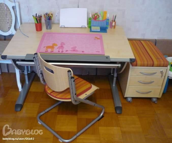 Регулировка парты по высоте от 51 см. от пола, рост ребенка меньше 115 см. и до 78 см. от пола, рост более 190 см. Угол наклона столешницы регулируется очень просто - достаточно нажать на рычак газлифта. Парта идет в комплекте с выдвижным ящиком с 2-мя разделителями, мы докупили к нему пластиковую вставку (для тетрадок во вставках место не рассчитано, для блокнотиков местечко нашлось). Стул регулируется по высоте, отдельно регулируется спинка и сидение. Тумба выдерживает нагрузку до 75 кг.