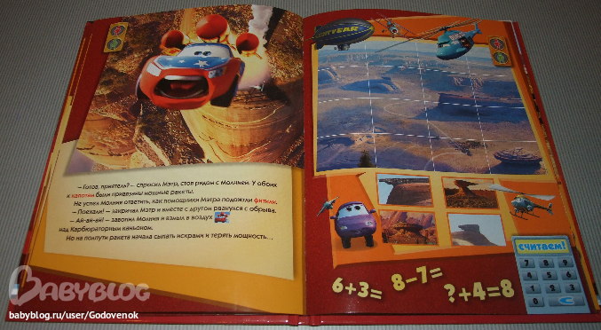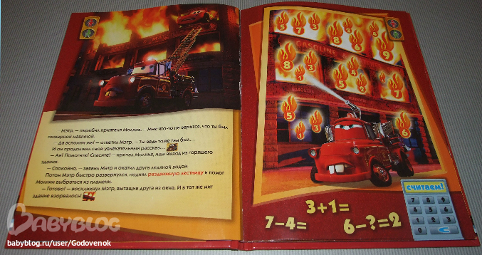 Каждый разворот это несколько абзацев текста, 3-4 задания, и иллюстрации. Указывая ручкой на основной текст, мы слышим рассказ; касаясь слов, выделенных красным светом, мы получаем справку – что эти слова означают; касаясь картинки в разных местах, слышим разнообразные звуки (толпа болельщиков гудит, вода из пожарного шланга шипит; если указать на флаг, то «волшебная ручка» назовет страну, которой этот флаг принадлежит; если коснуться дорожного знака, то ручка назовет его и объяснит его назначение). Вариантов взаимодействия с этой книгой очень много. Даже нажимая на одну и ту же картинку в режиме чтения и в режиме игры, мы слышим разные фразы (сама сказка и реплики героев озвучены очень эмоционально, дети в восторге).