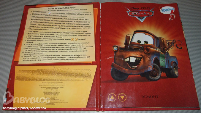 На первом развороте находится инструкция (как пользоваться книгой), название книги и картинка-регулятор громкости (два круга со стрелками, нажимая на которые можно сделать звук громче или тише). Динамик расположен в «волшебной ручке», на ней же есть выход для наушников. Нам это удобно: пока младший ребенок спит, я могу дать старшему поиграть с книгой.