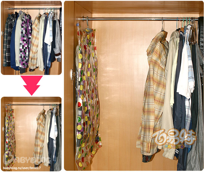 Самое главное забыла написать принцип. В низу крючка есть для вешелок место, т.е. одежда с вешалками вешается на крючек и потом ужимается, т.е. не на пакете груз весит, а на крючке.
