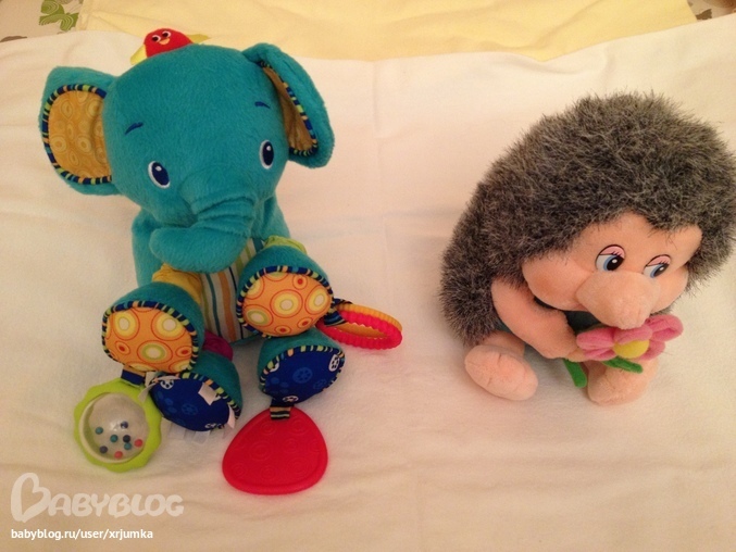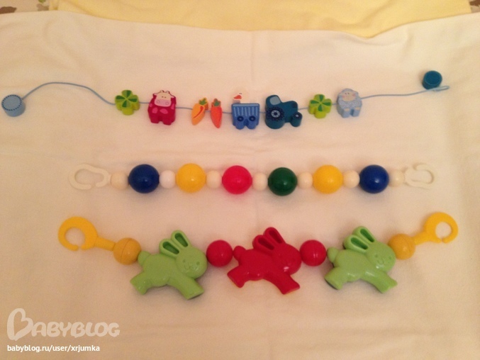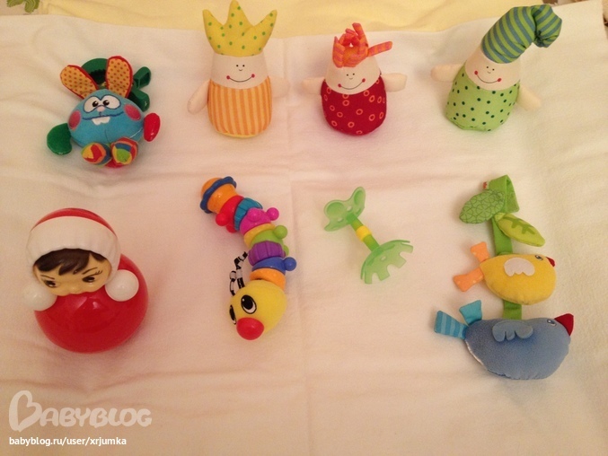 Заяц - давний фаворит! Толкала, разговаривала. Сеййчас научилась оттягивать его. 3 человечка - облизывает. Неваляшка - чуть раньше очень любила толкать. Сейчас облизывает, когда попадается на пути. Прорезуватель пиджен сейчас начинает активно изучать. Птички - смотрит и откидывает (у нас в ручке качелей прицеплены).