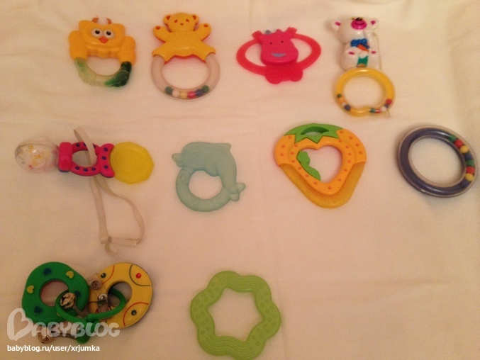 Вторая слева в первом ряду (стеллар) - очень удобно брать двумя ручками. Последняя (брайт старс) - любит давно смотреть, сейчас тоже взять нормально может. Второй ряд первая и те что на кольце две плюс последняя (3 штуки были вместе на кольце). Третий ряд: первую (хаба) - облизывает, на вторую(хаба) смотрит с удовольствием. И самая последняя (не знаю фирмы) - тоже удобно брать.