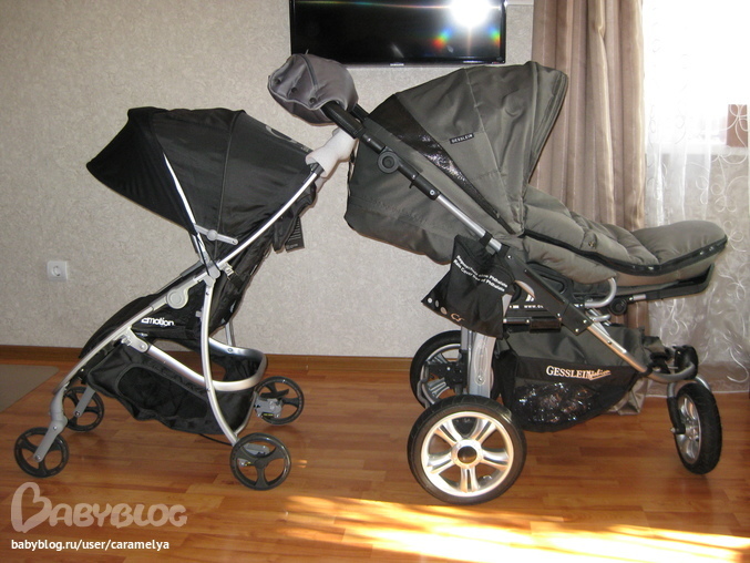 Основная прогулка у нас - танк Gesslein, нужна была компактная и легкая докатка с цельной ручкой, одинарными колесами, хоть какой-нибудь амортизацией, кучу всего перечитала, остановилась на Emotion, никак с мужем не могли определиться с цветом, я хотела зеленую или желтую, он настаивал на черной. И тут в Озоне была акция, скидка 20% на черный цвет, заказала, не думая, обошлась коляска в 9200 р.