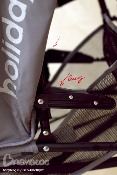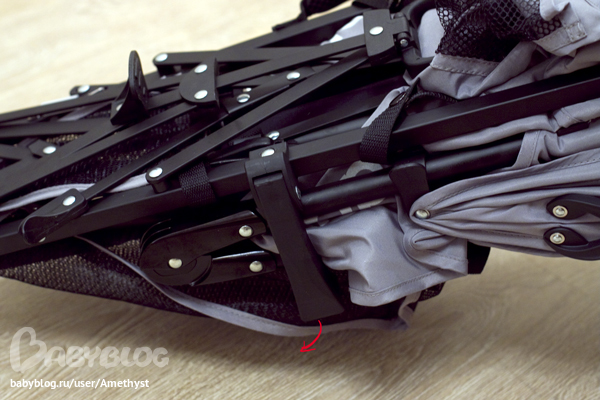 И напоследок беремся за ручку и, собрав все силы, несем.. несем.. Вес коляски не менее заявленной, это точно. А заявлено 8,5 кг. Для очень коротких перебежок нормально, если нужно, то можно катить ее за собой. Коляска не раскрывается засчет фиксатора, выглядит это так: