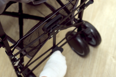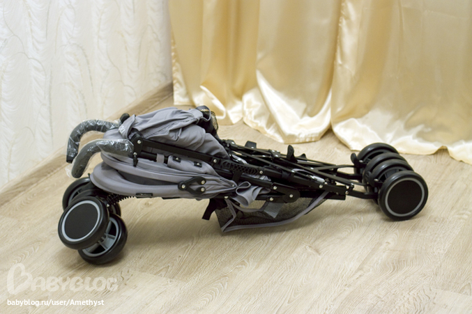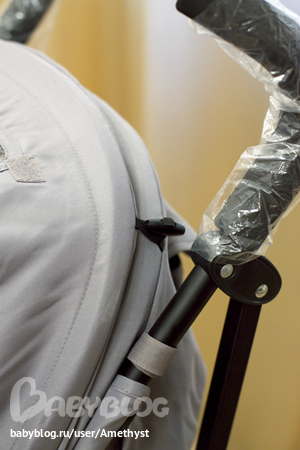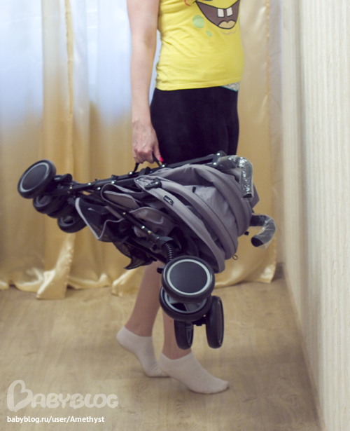 Чтобы собрать коляску, отжимаем механизм блокировки и тянем ручку наверх. Одной рукой собрать проблематично, правда я не тренировалась. :)