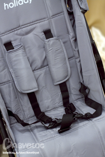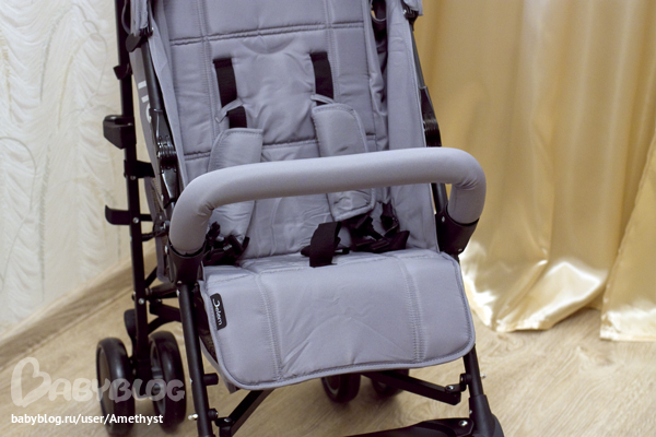 Напоследок в коляску была посажена дочка, ростом около 78 см. Сидение имеет небольшой наклон вниз в сторону спинки, поэтому ребенок сползать не должен. Бампер на хорошем уровне, на мой взгляд удобно держаться.