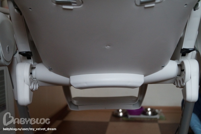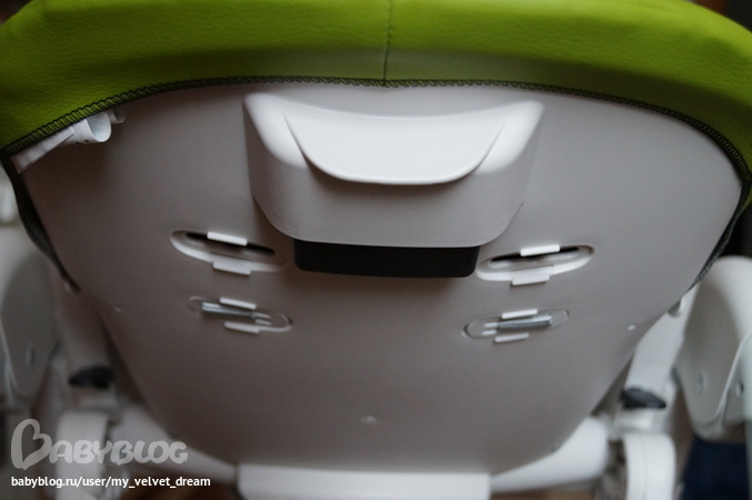 Сзади на спинке есть вот такая большая и удобная кнопка,которая как раз и регулирует положение спинки, а не кресла как в большинстве стульчиков.Это выгодно отличает папа зеро-3 ,то есть ребенка можно сюда помещать почти с рождения,нагрузка на позвоночник у ребенка будет минимальная: