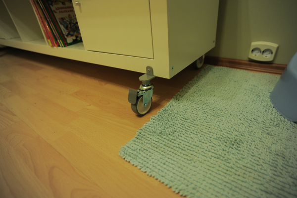 Стеллаж ИКЕА мы положили на бок, прикрутили систему колес, сверху положили столешницу и закрепили металлическими уголками, которых не видно при обычном взгляде. Ничего не видно, не перевернется, оч устойчиво. Легко заблочить колеса и работать или разблокировать колеса, откатить конструкцию и пропылесосить и помыть пол!!