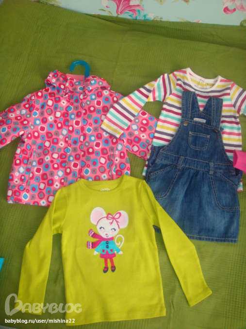 Плащик из ДМ, туничка и сарафанчик - Ашан (по 160 рублей), кофточка с мышей - Картерс (для двухлетки взяла размер 4 года - по плечам нормально, рукава длинноваты).