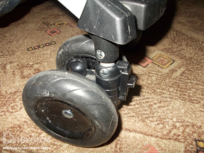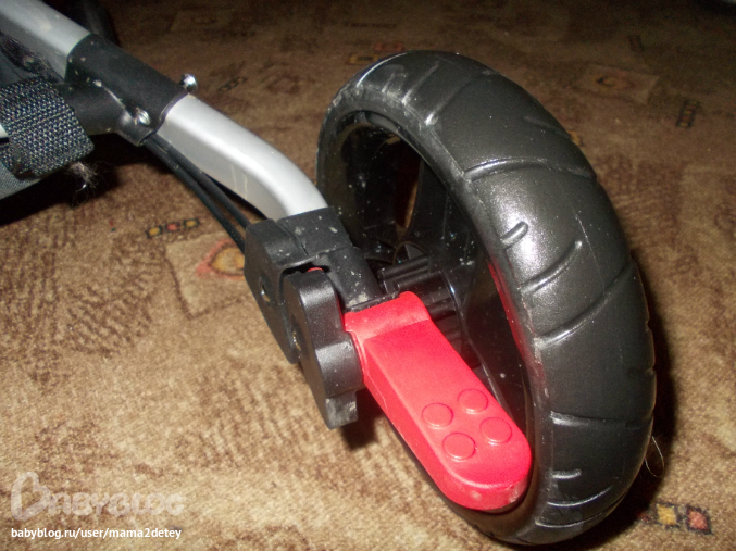 Колёса не пластиковые, немного пружинят при нажатии. После двух прогулок и езды по городу - не затёрлись. Передние фиксируются стандартным фиксатором (как на курносиках). Они снимаются.