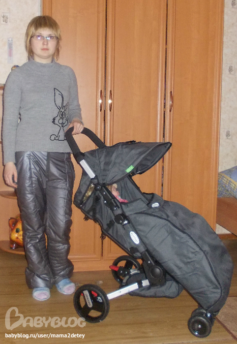 Закрытая футмуфтой (чехлом). Так закрыть можно только маленького, будет выше его головы. Вообще чехол крепится ниже, как на предыдущем фото. просто тут я ещё не знала, как будет с ребенком.