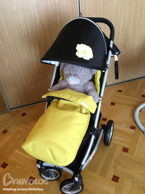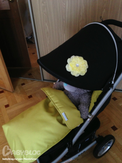 Поздравляю с покупкой! К нам тоже она на этой неделе приехала. С цветочком это вы здорово придумали, ведь действительно можно чем-то таким украсить колясочку. Скажите, пожалуйста, желтый конверт у вас какой фирмы?