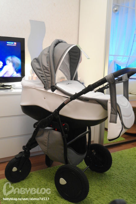 У нас такая, с такой же расцветкой, только в ткани. И знаете ничего плохого сказать не могу, вот только нам люлька быстро стала маленькой, мы в неполные 6 месяцев пересели в прогулку, но и там в зимнем костюме нам тесно, а уж если одеялко надо сверху, так вообще не подоткнуть, но это может мы крупные просто:) из проблем с колесами, у нас только пару раз болт откручивался, за крутили и проблем нет! Коляска очень маневренная, даже в узких магазинах есть где развернутся или на маленьком пятачке.