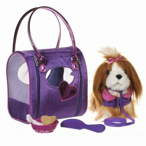у нас подобная чичи лав , тоже ссумочкой с аксами и в светящемся платье . размер около 20 см (собачка чихуахуа )дочь в восторге ..правда ей уже 8 лет )))