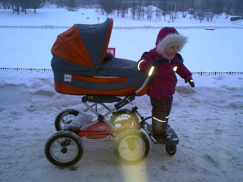 Сегодня тестировали в парке по льду и колдобинам - ребенок счастлив, ведь, как он сам говорит, ему не надо пешком ходить!..)))