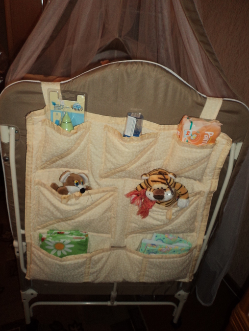 я сама шила..........хранила все мелочи.ножнички,соплеотсос,памперсы(по несколько штук)погремушки,расческу,ватные диски,палочки,крема...........он рядом с пеленальником у меня висел.каждый раз когда подмывались,купались,переодевались пользовались.а кармашки сделала на липучке,и полгода ребенок и не знал о его существовании