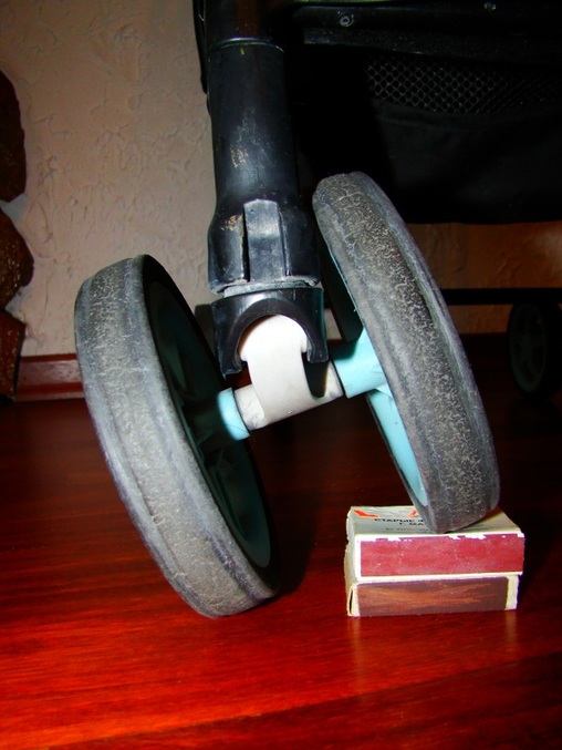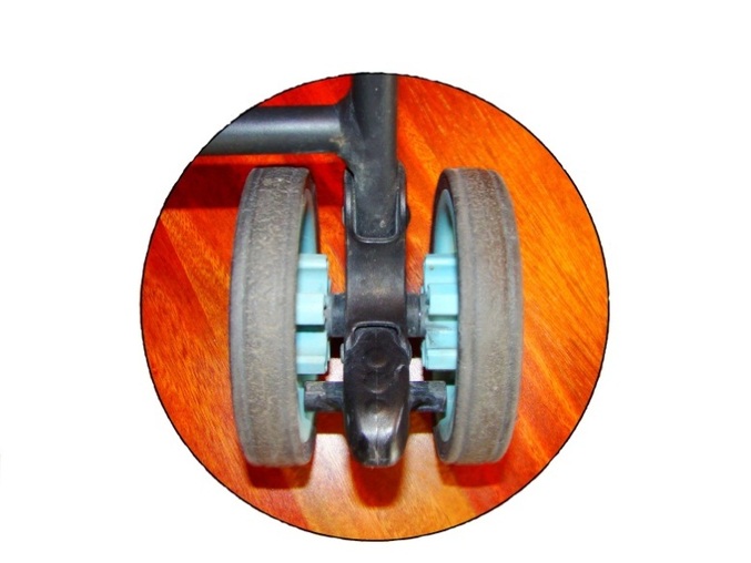 Все колеса сдвоенные, передние - поворотные с возможностью фиксации и гибкие для преодоления препятствий. Коляска в основном использовалась на брусчатке и хорошо по ней ехала. Но такие разрекламированные 3d-колеса зачастую попав в маленькую ямку упираются в кромку асфальта и стопорят коляску. Покрытие колеса деформируется уже на первых прогулках, но функций не теряют.