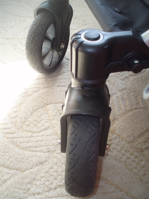 Шасси мне пришлось поменять на серебристое, т.к. белое было браковано (уже через три дня пользования слетели все защиты и оно само начало собираться ))) ), ждать 4 месяца до новой поставки я не хотела, а в наличии было только серебро. Может быть даже лучше, что так вышло, т.к., думаю, на шасси белого цвета, были бы очень заметны косяки, которые у меня на сером (о косяках ниже с фото) Колеса не стерлись, по-моему, ни на миллиметр после активного катания в течении 1,5 лет по не самым совершенным (слабо говоря) дорогам. Один раз смазывали все внутри силиконовой смазкой для профилактики.