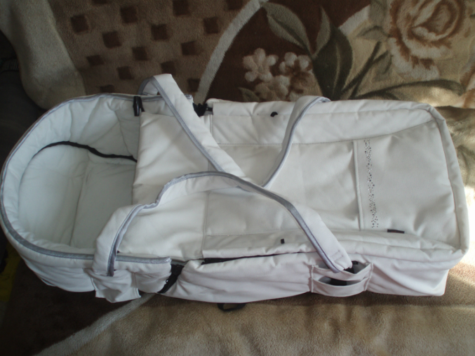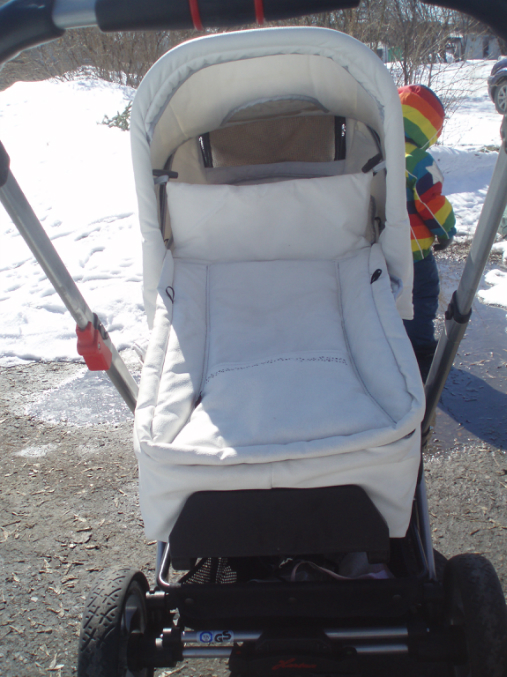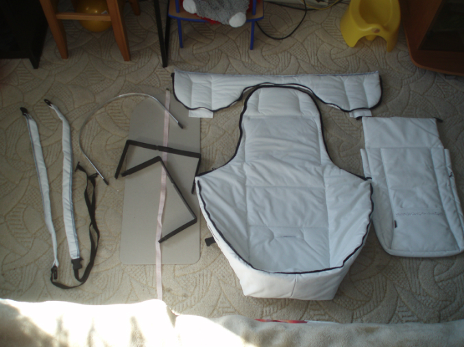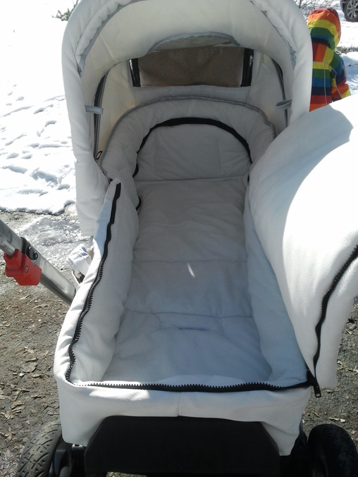 Убрав доску и ручки можно считать этот акс полноценным конвертом для прогулок (футмуфом), прорези для ремней безопасности там тоже есть. Конверт будет очень теплым, т.к. внутри все проложено синтепоном. И, наконец можно отстегнув изголовье и крышку на ножках, использовать его как матрасик (правда бока ни куда не денешь), но лично я приноровилась использовать вместе с изголовьем, и всю зиму меня этот акс очень выручал. Зима у нас суровая и я использовала еще и одеяло, но это лишь при ветре и начиная с -20, а так я свободно клала ребенка (кстати, можно и сидя, спинку переноски можно закрепить за спинку самого сиденья) в зимнем комбезе. По размерам эта переноска просто огромна (длина 77 +16 см. с отстегнутым изголовьем), ширина примерно 33 см, но при этом за счёт мягкости боков её можно «раздуть» ))) ) Мы начали в ней передвигаться с 6 месяцев до 1-1,2, потом потеплело и я в основном использовала удлинитель спального места. Конечно, я пользовалась переноской лишь на улице.