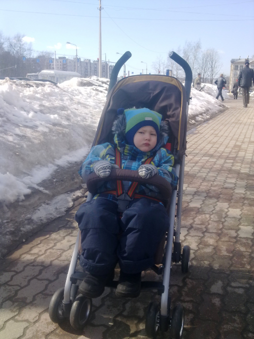 По слякоти и подтаявшему снегу, сразу скажу,- еле проехали, и то исключительно благодаря удобному центру тяжести у коляски и силе мамы, натренированной годами фитнеса ))) Приходилось даже пару раз ребенка из коляски вытаскивать и идти самим. Но это не беда: большой мальчик.Так что все-таки рановато пока для таких маленьких колес. А в целом мама и сын под приятным впечатлением.