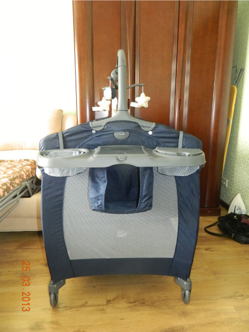 2.Пеленальный столик ( мне не понравился -на металлический каркас натянута тряпочка с тоненьким матрасиком в центре, мет.дуги ни чем не заизолированны-легко удариться даже при взмахах ручек и ножек),но основной пеленальник будет на комодике. 3.Дополнительные полки для памперсов и других детских принадлежностей -разумно использовать пространство нижнего уровня(полочки единое целое с верхним этажом,убираются вместе с ним). 4.Карусель с игрушками примитивненькая,с блеклыми тремя игрушками(две из них одинаковые) и одной мелодией.Буду подвешивать другие игрушки.Мобиль можно не снимая отвернуть-удобно. 5. "Лаз" на молнии фиксируется в открытом виде липучками,в застегнутом -карабинчиком к корпусу . 6.Электронный теромометр , таймер и часы без подсветки-лажа. 7.Элекромузыкальный блок с функцией вибрации и подсветки. Мелодии классические,звуки природы -звук льющейся воды смущает-памперсы придется чаще менять ;) .Вибро только для верхнего уровня(под матрасик кладется блок с батарейкой и подсоединяется к верхнему блоку управления,провод проходит в толще оббивки-не знаю будем ли использовать. Подсветка в двух вариантах-вверх (ни о чем ! только чтобы обнаружить в темноте манеж :)) и внутрь манежа ( мягкий голубой свет позволяет рассмотреть ,что твориться внутри ). 8.Есть колесики с фиксаторами -2 с одной стороныКомпактен в сложенном положении, сумка для переноски,можно везти в сложенном виде за собой на колесиках-очень удобно! 9. Замок-фиксатор, который защищает от произвольного складывания,да и вся конструкция выглядит качественно.В целом мне нравится,лучшее для себя не нашла,а как будет в эксплуатации -время покажет!