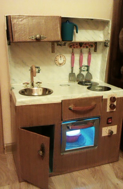 Ну вот он увлекся готовкой и я задумалась о кухне. Но тоже подумала, что тратить деньги на то, во что он не понятно будет играть или нет - бессмыслено ) Вот и сделала из картона