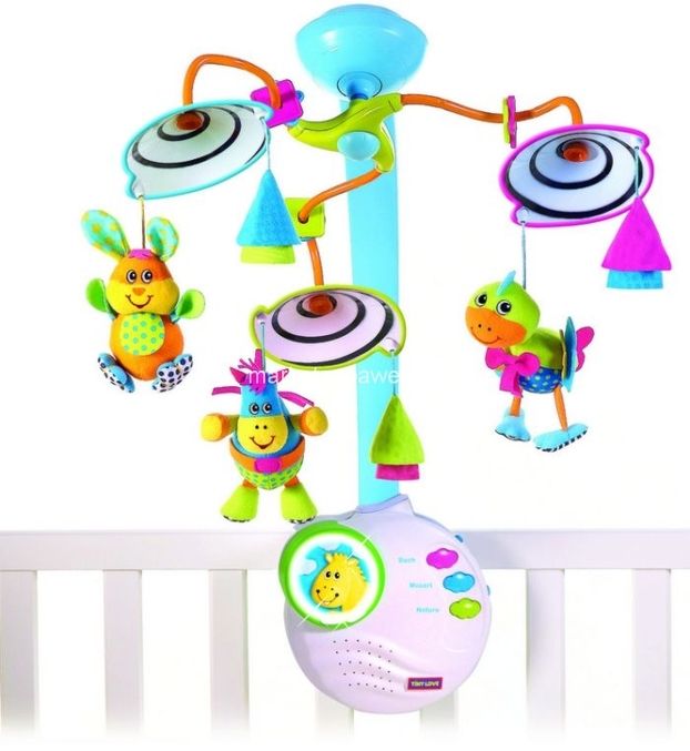 У нас тини лав бумбокс. Деть в восторге до сих пор. с 3 неждель слушали музыку с 5 уже наблюдали, в 2-3 мес час могла пролежать под ним))) и до сих пор нравится. потом будет играть без игрушек. просто музыка.