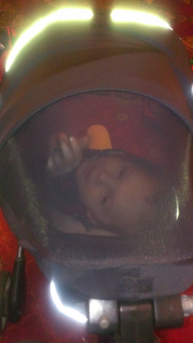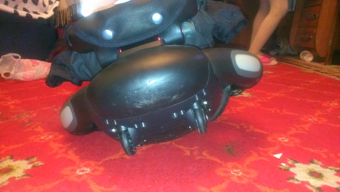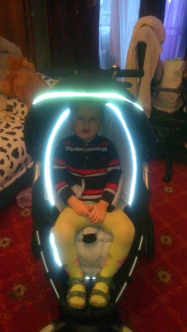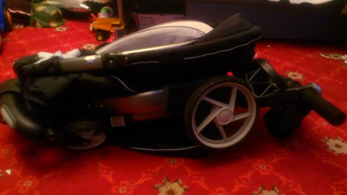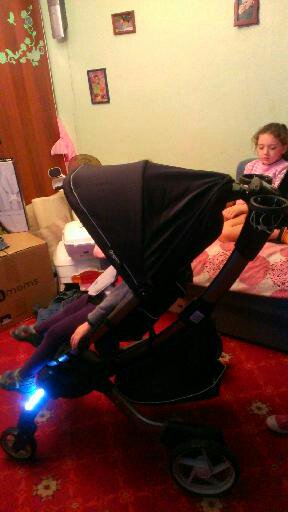 ну так вот имеются колесики как у чемодана. можно катить её за собой ну соответственно в сложенном виде. Вся она в полосках светоотражающихамортизация у неё ну ничего не скажешь хороша. есть за счет базыЕсли внутри ребенок она вам это покажет и напишет что не будет складываться. есть зарядка для неё от разетки, а вообще она заряжается когда вы ходите. Компьютер показывает сколько вы прошли от раскладывания до складывания. фары на боковинах светятся при движении и всегда в темноте. так же там спрятанны ещё несколько диодов и когда коляс считает что слишком темно идти. он их включает. Сверху компьютера на фото видно крепление это крепление сидушки она крепится двумя штырями сверху и снизу. которые так просто тоже не вынешь два подстаканника для мамы ну или папы )))) на ручке. так же есть два подстаканника для детя. мягких расположенны по бокам сидушкимальчишке в коляске три годика