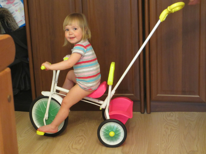 День 1 - ребенок очень радовался велосипеду, всячески ходила вокруг него, пыталась стоять и сидеть на нём разными способами.
