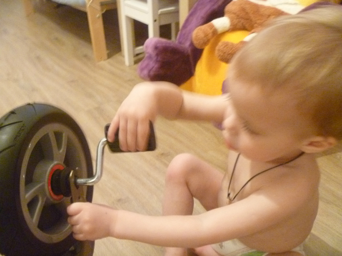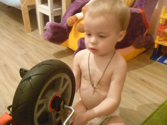 Прежде чем сесть на велосипед ,сын потребовал его перевернуть. Колеса-его слабость ,их обязательно надо покрутить!!