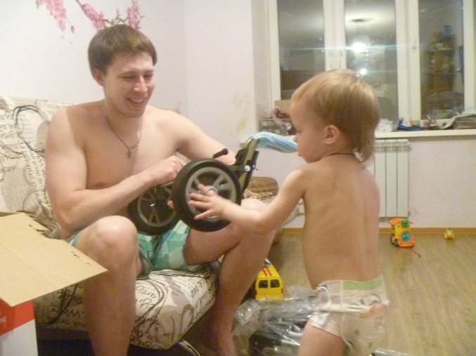 Папа приехал поздно, мы спать собирались уже, но хотелось собрать велик, чтоб сегодня уже прокатится)