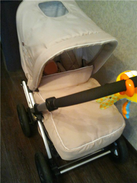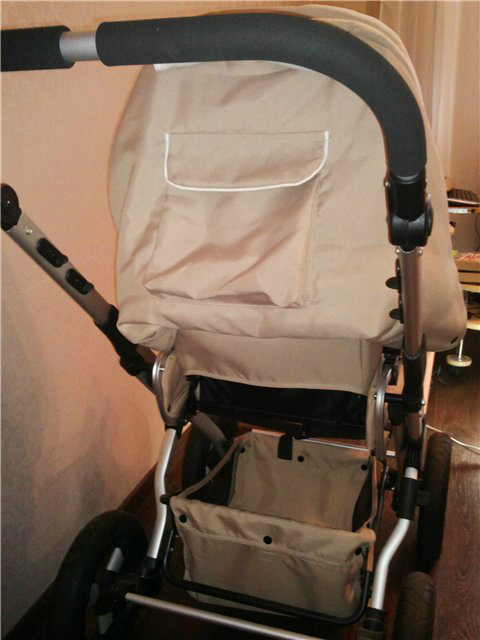 Вместительная корзина для покупок с жёстким дном – легко снимается для стирки, так как крепится на кнопки. Вес коляски с коробом 16 кг, вес прогулки 13 кг. Абсолютно вся тканевая обивка снимается и стирается при 30 градусах в машине! Хотя всю коляску можно и не стирать – достаточно протереть водой с порошком и даже разводов не остаётся. Ткань коляски не выгорает на солнце, приятна на ощупь – красивый универсальный бежевый цвет.