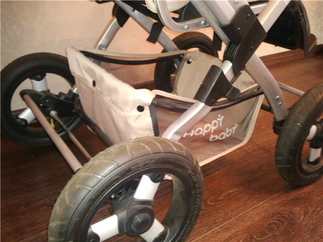 Шасси: рама сделана из современного легкосплавного алюминия, 4 надувных колеса в рельефным протектором на подшипниках - диаметр 30 см! (снимаются одним нажатием на кнопку), тормоз-самоискатель на передних и задних колёсах, достаточная амортизация, очень устойчивая, проходимая конструкция. Для снижения или повышения жесткости хода достаточно отрегулировать давление в шинах. Длина коляски 105 см, ширина 60 см – входит в маленький пассажирский лифт. Тип складывания – книжка (в сложенном виде не фиксируется).