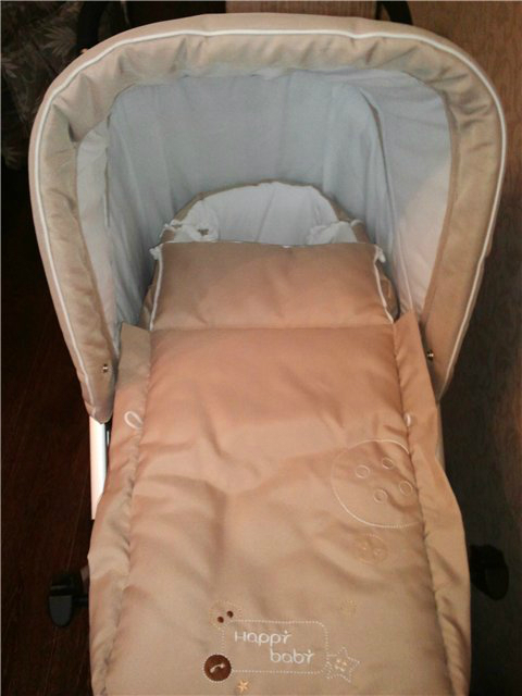 Люлька: на прогулочную систему устанавливается люлька-переноска утеплённая синтепоном с твёрдым основанием и твёрдыми боковинками. Люльку можно просто поставить на коляску, а можно и надежно закрепить на четыре карабина. Внутри люльки есть прорези для пристёгивания ребёнка ремнями безопасности. Размер люльки-переноски - 66 на 30 см, благодаря молниям на изголовье - удлиняется ещё на 20 см. У люльки имеются мягкие ручки для переноски (можно носить на плече). Внутренняя обивка люльки – 100% хлопок, экологичный и очень легко стирающийся даже при низких температурах воды в стиральной машине.