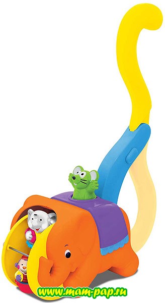 Каталка "Цирковой слон" снабжена складной ручкой, поэтому ее можно использовать как каталку, которую малыш будет везти перед собой, а можно - как обычную игрушку. Для этого надо просто сложить ручку. Цирковой слон как бы держит хоботом и передними ногами колесо, в котором во время движения крутятся маленькие зверьки. Кроме того, в спине есть отверстие, откуда высовывается зеленая мышка. Во время движения слышится притяная мелодия.
