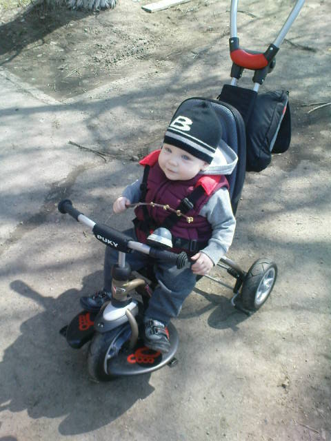 Он уже и сам через бампер залезать в велосипед научился).